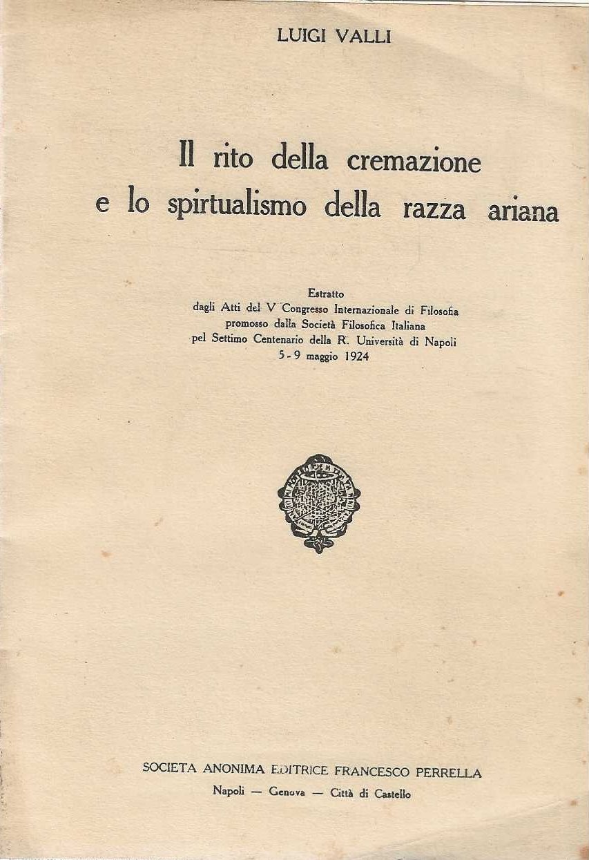 Il rito della cremazione e lo spiritualismo della razza ariana. estratto dagli Atti del V Congresso Internazionale di Filosofia promosso dalla Società Filosofica Italiana pel Settimo Centenario della R. Università di Napoli 5-9 maggio 1924