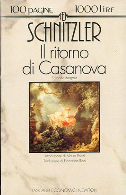 Ed. integrale. 95 p. ; 21 x 13 cm. 100 pagine 1000 lire, 154. Il Casanova di questo racconto rappresenta per Schnitzler il confronto con il problema della vecchiaia, dell'insuccesso, della morte: meschino, pedante, grigio, oppresso dal pensiero di una fine imminente, inesorabilmente diretto sul viale del tramonto, l'antio avventuriero veneziano finisce per diventare il simbolo del rifiuto di accettare la trasformazione e il passaggio del tempo. Introduzione di Mauro Ponzi. Titolo originale dell'opera: "Casanovas Heimfahrt". Traduzione di Francesca Ricci. Brossura editoriale, coperta in cartoncino flessibile plastificato lucido, illustrata a colori. Qualche segno del tempo alla coperta e alle pagine interne (ingiallimento) per il resto libro accettabile. Codice libreria 6643.