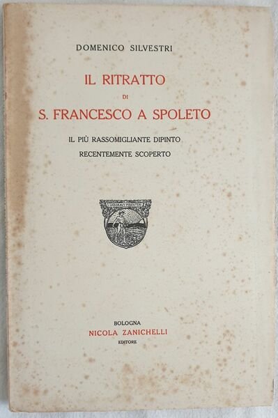 Edizione del 1926 di questo studio su un ritratto di San Francesco ritrovato a Spoleto, il più rassomigliante alla figura del Santo a cura di Domenico Silvestri. Da cornice alla narrazione alcuni episodi della sua vita. Otto planches fotografiche mostrano diversi dipinti del Santo e vedute della città di Spoleto. In buone condizioni. Copertina editoriale in buone condizioni generali. Legatura in buone condizioni. Pagine in ottime condizioni con rare fioriture ancora da rifilare. In 8. Dim. 24x16 cm. Pp. 64 Edition of 1926 of this study about the portrait of Saint Francis found in Spoleto, the most similar portrait written by Domenico Silvestri. Some happenings of his life. Eight photographic platees feature different paintings of the Saint and views of the city of Spoleto. In good conditions. Editorial cover in good general conditions. Binding in good conditions. Pages are in very good conditions with occasional foxings still uncut. In 8. Dim. 24x16 cm. Pp. 64