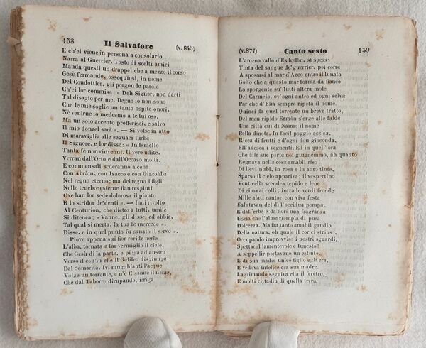 Edizione del 1845 di questo poema del romanziere drammaturgo e poeta torinese Davide Bertolotti (1784-1860). Nota manoscritta al frontespizio che specifica l'origine dell'autore. Timbro di biblioteca privata al verso del frontespizio. In discrete condizioni. Copertina editoriale in mediocri condizioni generali con usure e parti mancanti ai margini e dorso. Piatrto anteriore assente. Legatura in mediocri condizioni con rotture. Pagine in buone condizioni con fioriture. In 16. cm 15,5x9,5. 301+(1).Edition of 1845 of this poem by the novelist, dramawriter and poet from Turin Davide Bertolotti (1784-1860). Handwritten note in the title page specificating the origin of the author. Stamp of private library in the verso of title page. In fair conditions. Editorial cover in poor general conditions with wearings and lackings in the extremities. Front plate lacks. Binding in poor conditions with cracks. Inside pages are in good conditions with foxing. In 16. cm 15,5x9,5. 301+(1).