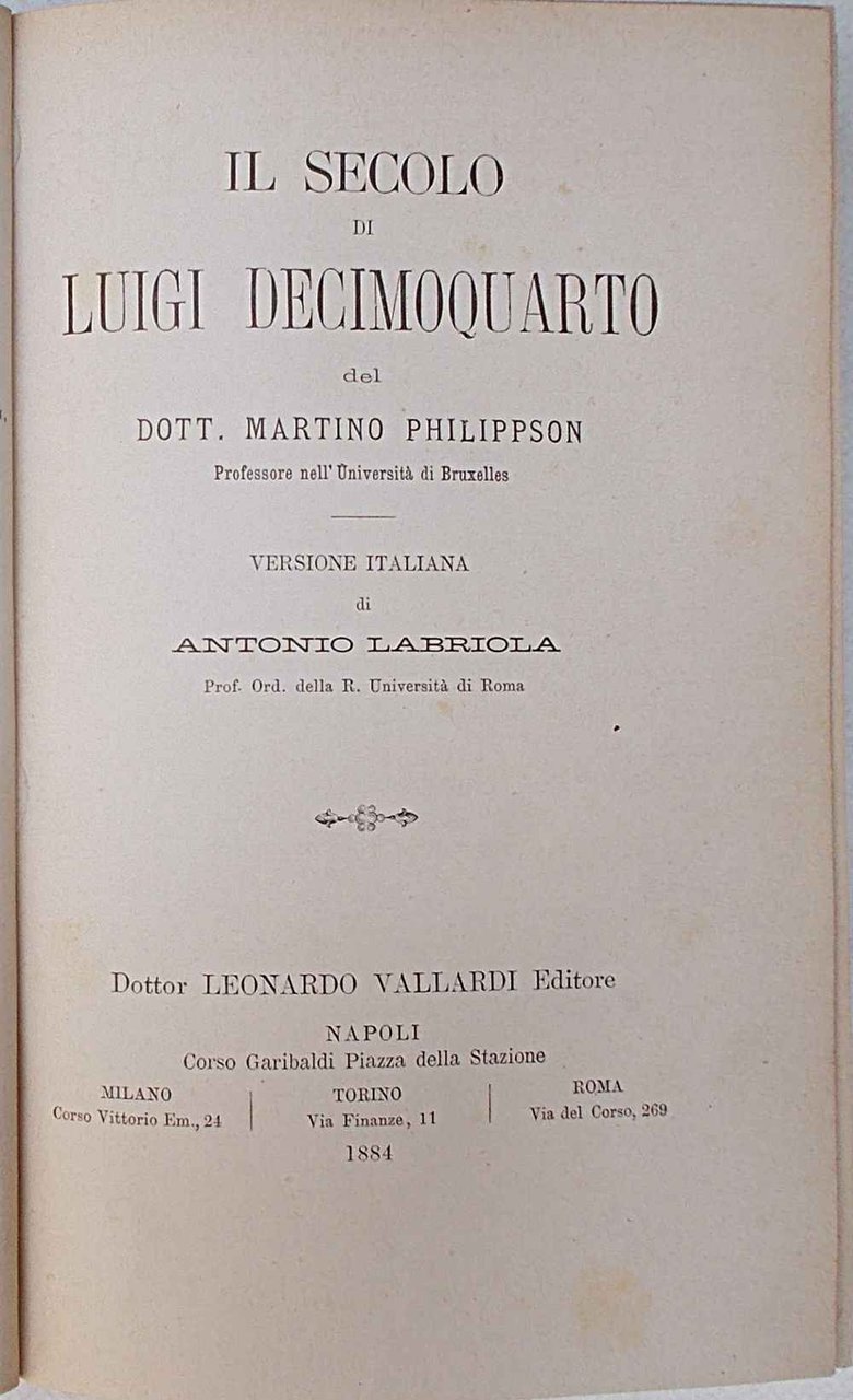 In 8° (cm. 25 x 16); pagg. 644; con 18 tavole n.t. protette da veline, 3 riproduzioni di manoscritti ripiegate f.t. e 45 incidioni n.t.; tela origin. con titoli in oro al dorso. Bruniture, ma ottimo. VG-. ** Volume della "Storia Universale Illustrata" di Guglielmo Oncken. Versione italiana di Antonio Labriola.