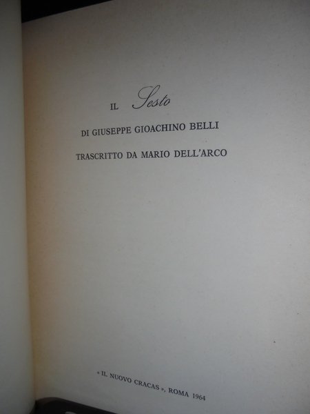 di Giuseppe Gioachino Belli. Roma, Il Nuovo Cracas, 1964. Il Sesto. Trascritto da Mario Dell' Arco. In-8°, cart. edit. con sovracopertina. xvii, pp. non numerate. Sovracopertina con lievi segni del tempo. Libro in ottimo stato di conservazione. Neg. Bol. mob. S. carc.
