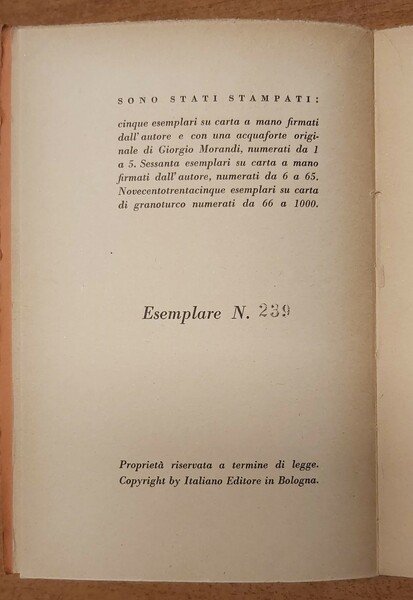 in-16, pp. 166, (2), bross. edit. con cop. fig. di Morandi. Con 22 disegni di G. Morandi n.t. Ediz. orig. a tiratura limitata a 935 esempl. numerati (ns nr. 239). Belliss. esempl. parzialm. a fogli chiusi. [344]