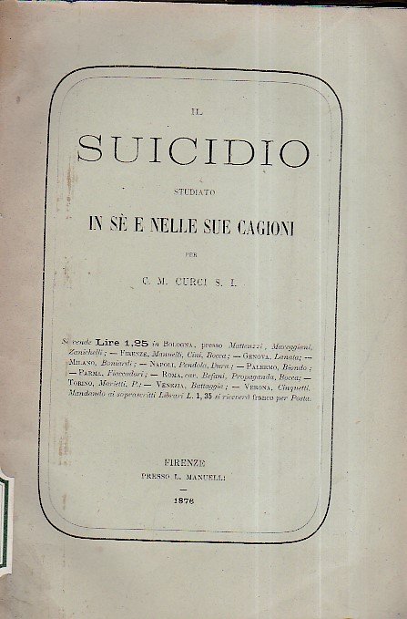 In-8°, pp. XII, 124, brossura editoriale. Bell'esemplare. Studio del noto gesuita napoletano sul problema morale e sociale del suicidio, qui severamente condannato alla luce della morale cattolica. A detta del Curci, anche se l'uomo in vita soffre molti patimenti, tanto da voler porre fine alla vita stessa, ci sono 'molte e buone ragioni di rimanere nella vita finché la Provvidenza vi ci lascia; e ciò non per la sola paura dell'inferno, ma perché intendiamo che ciò a noi è utilissimo'. Un capitolo è dedicato al problema del suicidio in Giacomo Leopardi. Carlo Maria Curci (Napoli, 1809-Firenze, 1891), sacerdote gesuita e teologo, assiduo collaboratore della 'Civiltà Cattolica', fu fierissimo oppositore del Gioberti. Inizialmente avverso all'Unità d'Italia, dopo la presa di Porta Pia compose tuttavia diversi scritti a favore del nuovo Stato italiano, subendo a causa di essi la radiazione dalla Compagnia di Gesù, in cui fu riammesso dieci giorni prima della morte.