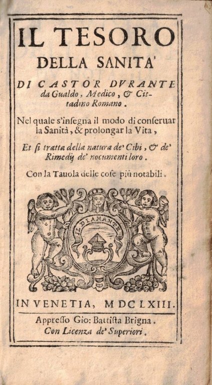 IL TESORO DELLA SANITA'. - Nel quale sinsegna il modo di conservar la Sanità, & prolongar la vita. E si tratta della natura de Cibi, & de' Rimedii de' nocumenti loro.