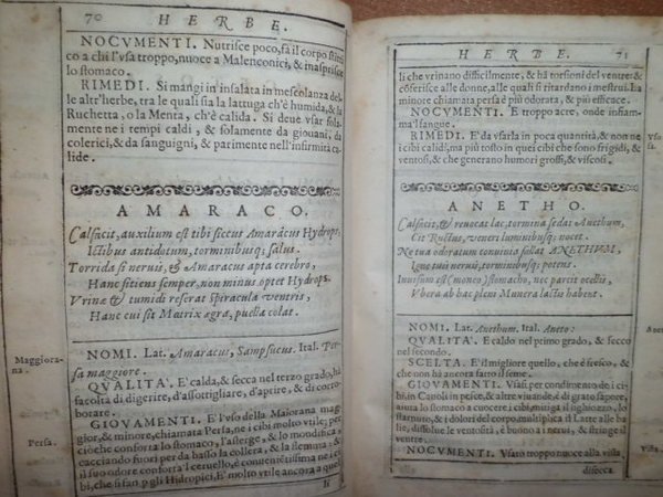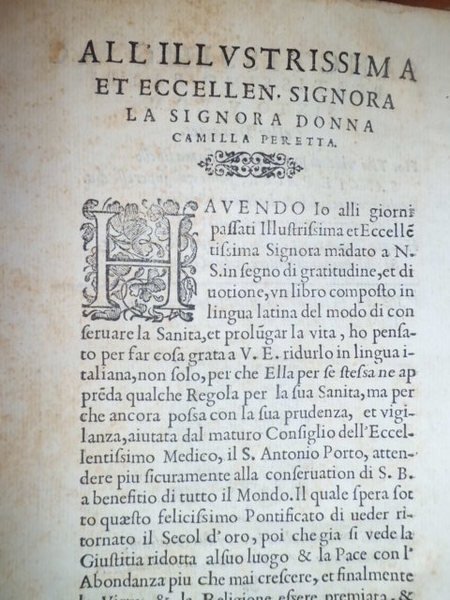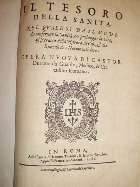 Il Tesoro della Sanità - Nel quale si da il modo di conservar la Sanità, e prolungar la vita, e si tratta della Natura de' Cibi, e de i rimedij, de i Nocumenti loro. Castor, Durante. In Roma, Ad istantia di Iacomo Biricchia, Appresso Francesco Zannetti, 1586. In-4°, piena pergamena coeva, titolo manoscritto sul dorso, marca gesuitica al frontespizio, ritratto xilografico dell'Autore. (8), 296, (8) pp. Testo inquadrato in caratteri romano e italico. Bell' esemplare con le usuali lievissime arrossature della carta. Edizione originale rarissima sconosciuta al Vicaire, che citando la ristampa del 1589, scrive: On y trouve des chapitres intéressant sur les aliments qui servent de nourriture à l' homme, les legumes, les fruits, les vivandes, poisson, condiments, sur l' eau, le vin, etc. Quest' opera è un vero trattato di bromatologia e igiene alimentare, quale poteva concepirsi nel secolo XVI. Repertorio di igiene, medicina e sopratutto di gastronomia, curioso e di notevole interesse, che dopo un' introduzione generale, dedica ampio spazio ai cibi (frumenti, legumi, herbe, radici, frutti, carni, pesci, condimenti), descrivendone le qualità, i nomi, l' utilizzo in cucina, i vantaggi ed i possibili effetti nocivi. Un capitolo speciale è dedicato ai vini, descritto dal Simon (Biblioteca bacchica, II, 201) che cita l' edizione del 1588. Il Durante, di Goaldo (Spoleto), illustre medico e botanico, insegnò alla Sapienza di Roma. Hirsch, II, p. 350. Durling, 1333. Paleari-Henssler, I, p. 266. Rhodes, Vita ed opere di C. Durante, passim. Manca a Bitting, Notaker, Wellcome, Waller, ecc.