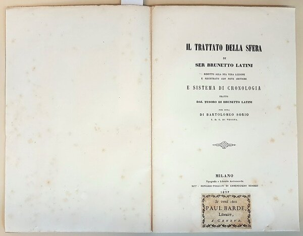IL TRATTATO DELLA SFERA di SER BRUNETTO LATINI ridotto alla sua vera lezione e illustrato con note critiche e SISTEMA DI CRONOLOGIA tratto dal Tesoro di Brunetto Latini