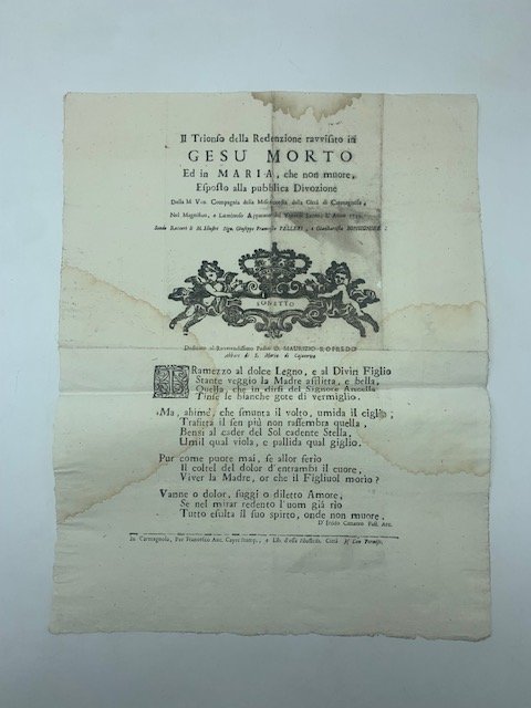 Manifesto cm 37 x 47, piega al foglio, alcune gore, piccolo forellino che tocca una lettera del componimento poetico. Illustrazione xilografica in testa. Manifesto pubblicato in occasione della processione del Cristo morto del Venerdi' Santo, che si svolgeva a Carmagnola, curata dalla Confraternita della Misericordia. Comprende un sonetto scritto dal pastore arcade Irildo Canateo, pseudonimo di Gio. Francesco Antonio Pelleri.