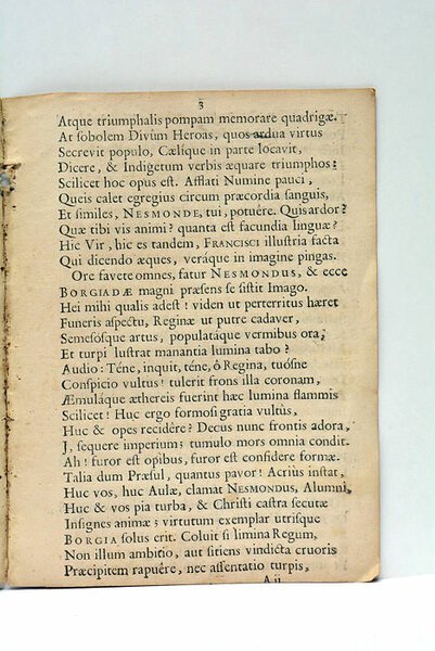 8 pages. (20x16 Cm). Dérelié. Feuillets un peu écornés. Papier légèrement bruni. Minimes déchirures dans les marges intérieures. Pièce littéraire rédigée en l'honneur du jésuite Saint François de Borgia, avec une figure emblématique gravée représentant sa personnalité morale. Cette gravure placée en frontispice est l'oeuvre du peintre et graveur français Louis Cossin. Première édition.