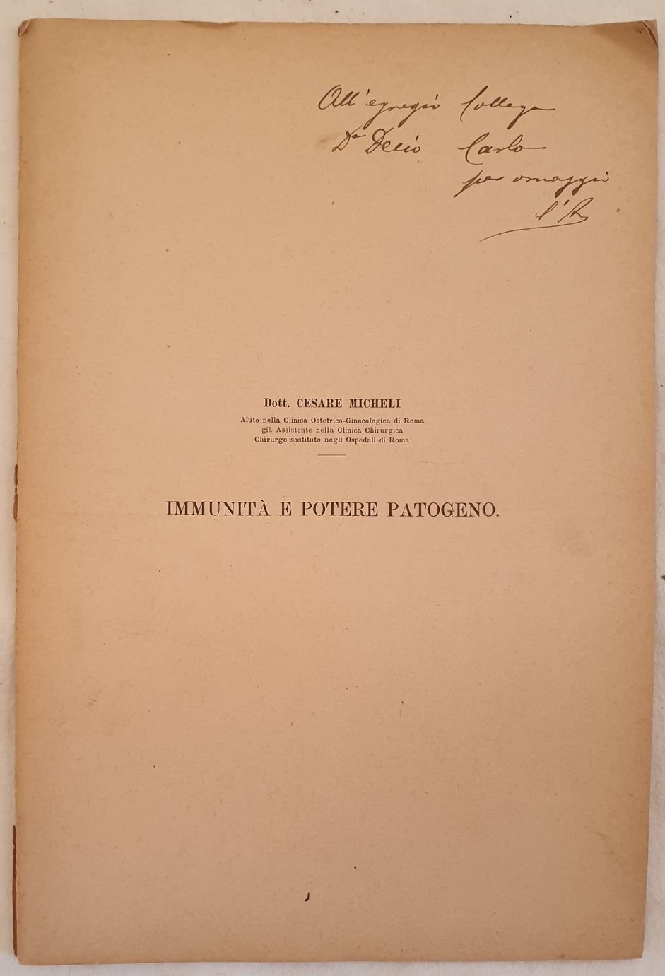 Interessante e rara pubblicazione del 1898 scritta da Cesare Micheli sull'immunità ed il potere patogeno dei microbi. Estratto dal volume per il XXV anno dell'insegnamento chirurgico di Francesco Durante nell'Università di Roma. In copertina dedica dell'autore senza firma. Brossura editoriale in buone condizioni generali. Piegature. Legatura in ottime condizioni. All'interno le pagine si presentano in buone condizioni con fioriture. In 4. Dim. 30x20 cm. Pp. 24. Interesting and scarce pamphlet of 1898 written by Cesare Micheli about immunity and pathogenic power of mycrobes.<BR>Extract from the volume for the XXV year of surgical teaching of Francesco Durante in the University of Rome. In the cover dedication of the author without signature. Editorial cover in good general conditions. Foldings. Binding in good conditions. Inside pages are in good conditions with foxings. In 4. Dim. 30x20 cm. Pp. 24.
