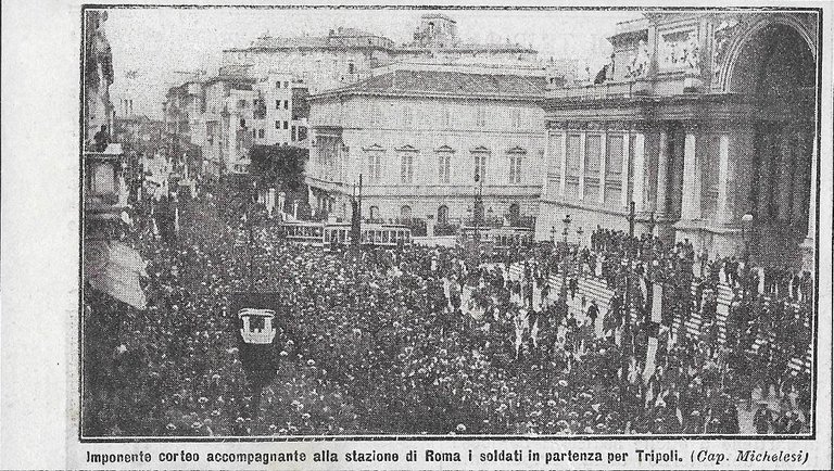 Imponente corteo accompagna alla stazione di Roma i soldati in partenza per Tripoli. Advertising 1911