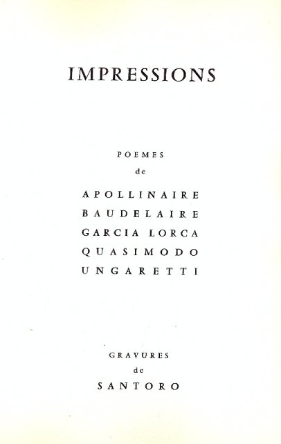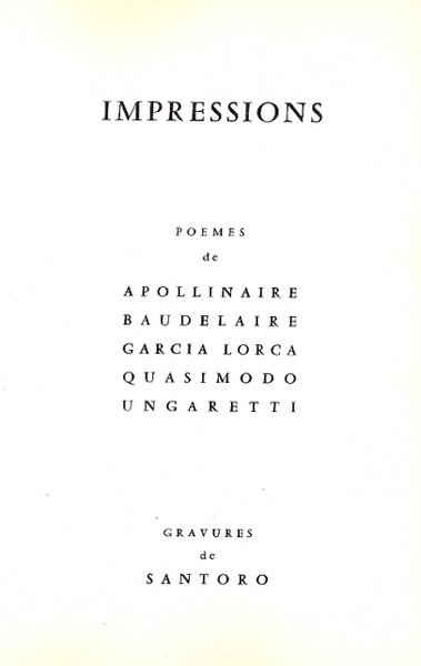 Impressionis. Poemes di, Apollinaire, Baudelaire, Garcia Lorca, Quasimodo, Ungaretti. Gravures de Santoro.