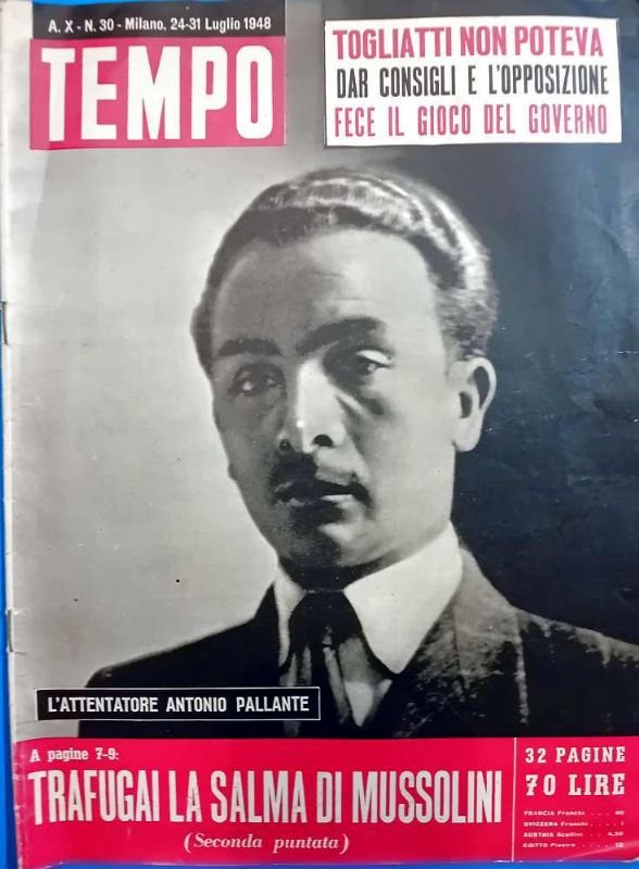 In copertina l'attentatore a Togliatti, all'interno un articolo e seconda puntata sul trafugamento della salma di Mussolini.