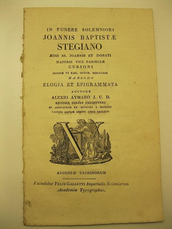In funere solemniori Joannis Baptiste Stegiano, edis ss. Joannis et Donati majoris vici paroeciae curioni. Ibidem VI kal. octob. 1812, habendo elogia et epigrammata auctore Alexio Aymaro J.U.D., ejusdem curiae presbyterio et aedituorum ex - ministro a secretis Taurini septem abhinc annis degente