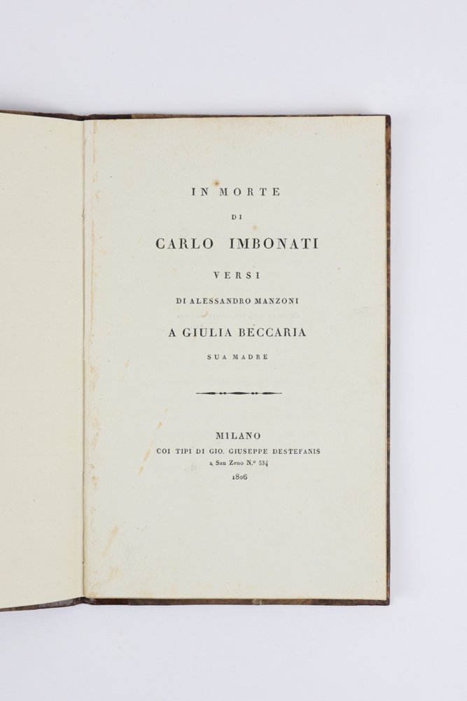 LIBRO Prima edizione in Italia dopo la stampa parigina di Didot. Ottimo esemplare nella tiratura in carta grande (213 x 133 mm), freschissimo all’interno. Il 15 marzo 1805 morì a Parigi Carlo Imbonati, da anni legato a Giulia Beccaria, madre di Manzoni. Il giovane Alessandro la raggiunse nella capitale francese e compose per lei i versi dell’epistola consolatoria: pur non avendo conosciuto di persona Carlo Imbonati, ne tracciò un ritratto ampiamente elogiativo, elevandolo a proprio modello intellettuale e a maestro di rettitudine. Il carme fu impresso per la prima volta a Parigi in una placchetta di soli 100 esemplari fuori commercio. A distanza di pochi mesi, nel marzo 1806 uscì l’edizione Destefanis che qui presentiamo, seguita a stretto giro da una rarissima edizione romana in cinquanta esemplari presso la Stamperia Caetani all’Esquilino e da una bresciana presso Niccolò Bettoni. La stampa milanese fu realizzata per le cure di Giambattista Pagani, intimo amico degli anni giovanili, che di propria iniziativa inserì in apertura una lunga dedicatoria a Vincenzo Monti, «principe de’ poeti moderni»: Manzoni andò su tutte le furie, gli chiese di ritrattare pubblicamente, ma senza alcun risultato. Dopo la conversione l’autore sconfessò il carme, ritenendo indecorosa la celebrazione dell’amore extraconiugale della madre, e ne vietò la ristampa. Molto raro, se ne riscontrano solo cinque esemplari nel catalogo Sbn. Vismara, Bibliografia manzoniana, n. 193; Pionna, Giambattista Pagani (Milano 2001); il sito internet Alessandromanzoni, s.v. (scheda di Carmela Marranchino)
