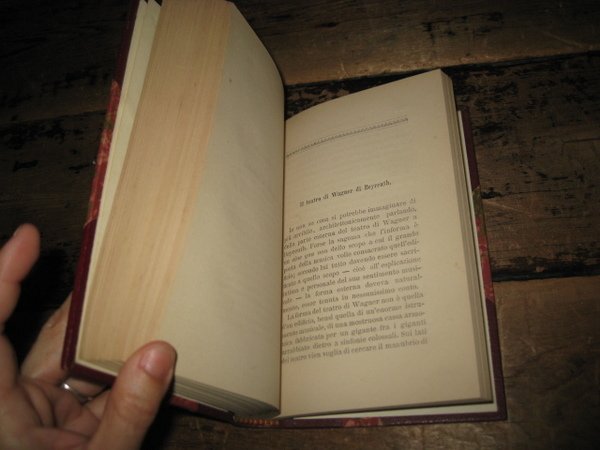 In-16°, pp. VIII, 374, legatura moderna m. pelle rossa e angoli con titolo, fregi e filetti in oro su dorso a nervetti e piatti marmorizzati. Svariati disegni f.t. riproducenti schizzi presi in loco. Ottima copia. Prima edizione di questo resoconto di viaggio in Germania steso dal ben noto commediografo scapigliato milanese, oggi noto soprattutto per aver composto i libretti delle prime due opere di Puccini, 'Le Villi' e 'Edgar'. Le impressioni qui contenute trattano nell'ordine di Berlino, Bayreuth (con i ricordi legati al teatro di Wagner), Monaco di Baviera, Norimberga, Francoforte, Heidelberg, Worms, Strasburgo. Cfr. Rossano Pisano in D.B.I., XLVIII, 1997.