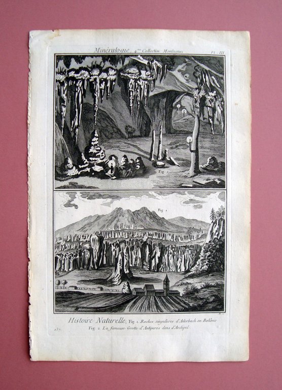 Incisione Histoire Naturelle Roches Aderbach Boeme Grotte Antiparos Diderot 1751