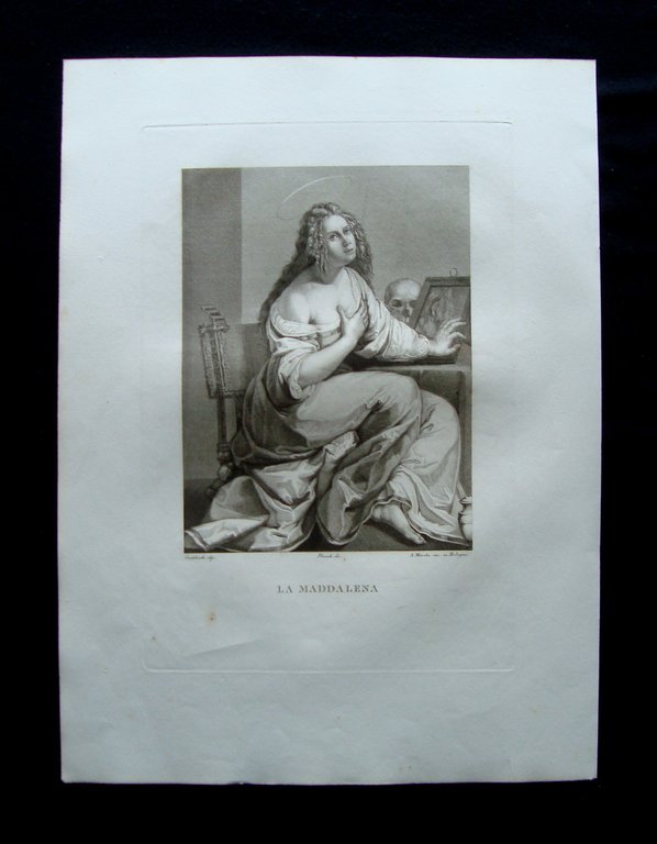 Incisione su rame d'epoca 1842 , LA MADDALENA Da un dipinto di Gentileschi incisore A. Marchi tratto da Galleria Pitti illustrata per cura di Luigi Bardi Firenze coi Tipi della Galileana 1842 Incisione a bulino (su rame), Tipi della Galileiana Firenze 1842 , cm 44x32,5 misura del foglio Condizioni di conservazione. ottimo stato di conservazione, qualche piccola brunitura (foxing). Incisione d'epoca originale (1842). SC03.D14868F blu