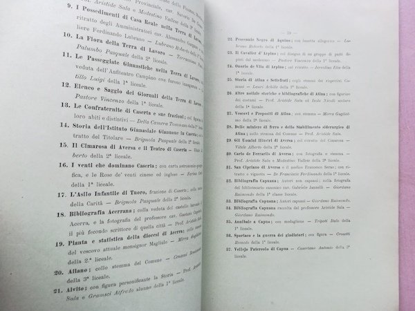 In 4 (cm 19 x 29), pp. 52. Brossura editoriale. Bell'esemplare stampato su carta colorata verdina. Indice descrittivo dei documenti, libri, illustrazioni, tavole, saggi raccolti da Aristide Sala, insieme ai suoi allievi, che componevano i 5 grandi volumi presentati ad illustrazione della regione della Terra di Lavoro alle Esposizioni di Milano, Imola, Torino, Capua.