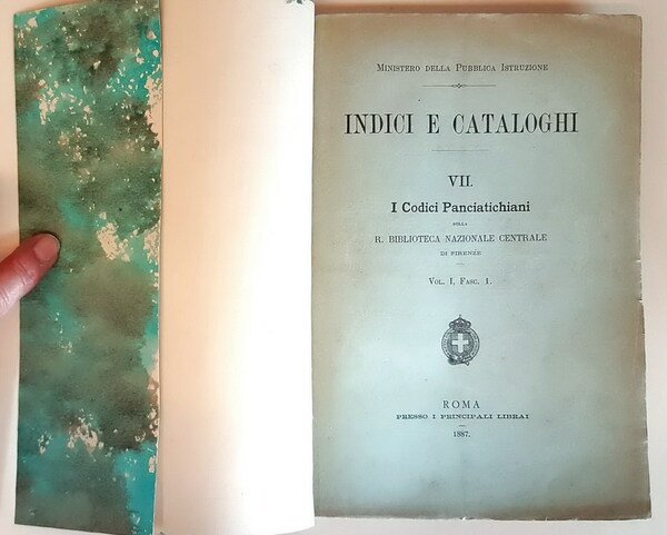 Edizione: n. 3 fascicoli formanti il vol. 1 relativo ai codici panciatichiani appartenente alla collana degli indici e cataloghi (parte vii.) pubblicata dal ministero della pubblica istruzione.