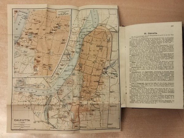 In 16°, p. tela ed., pp. LXXIV + 358 + 22 carte + 33 piante + 1 carta geografica dell'India, di cm. 40 x 52, conservata nella tasca all'interno del piatto post. Lettere al d. ed al piatto ant. in o. Prima ed unica edizione in lingua tedesca, mai tradotta in altre lingue.