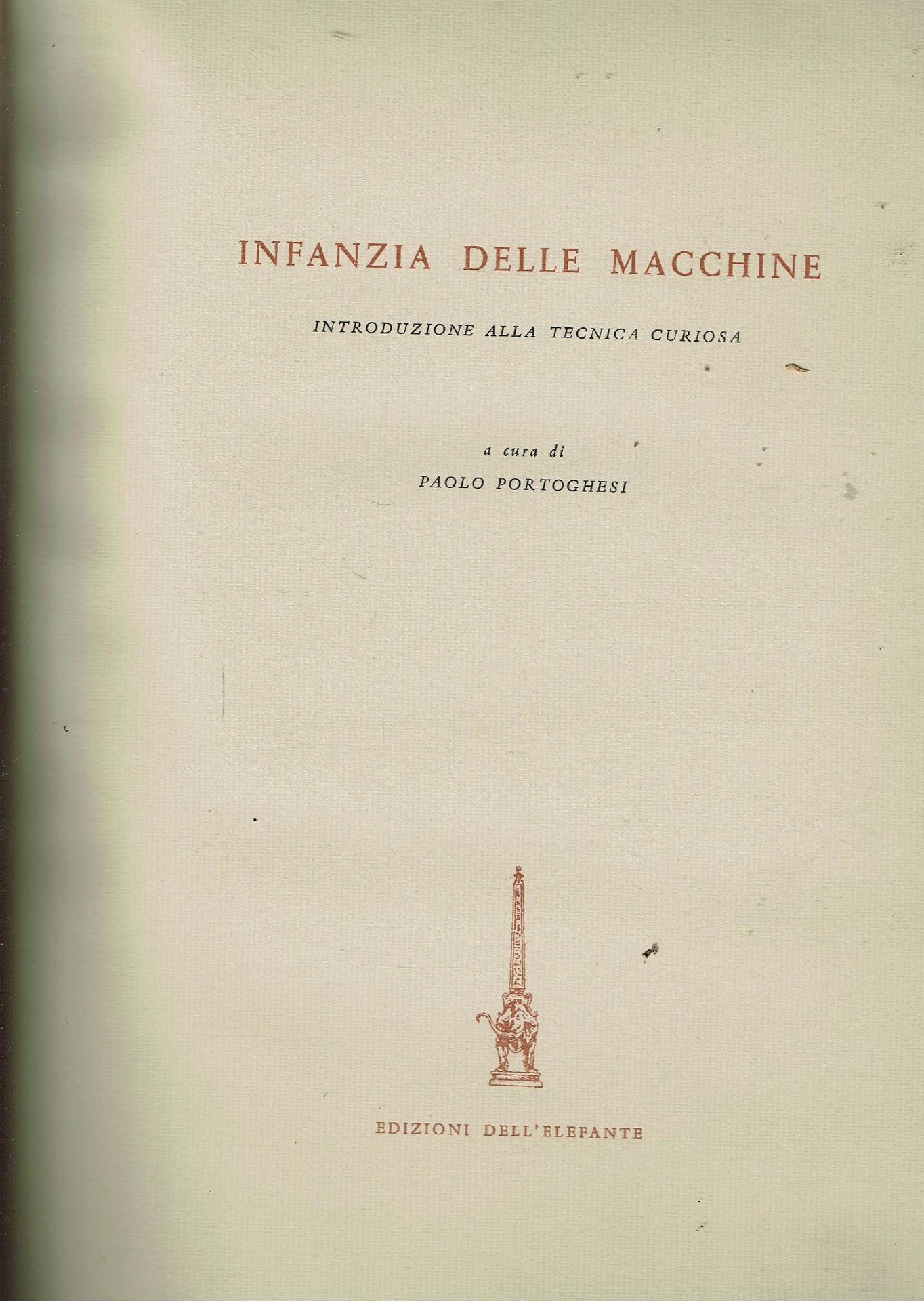 Infanzia delle macchine. Introduzione alla tecnica curiosa. 90 riproduzioni di incisioni nel testo e 8 tavole sciolte raccolte in cartelletta Stampa su carta Miliani di Fabriano, con gli zinchi di Cesare Volterra, a cura dell'Istituto Grafico Tiberino, per conto delle Ed. dell'Elefante, sotto la direzione artistica di Enzo e Grazia Crea 4to. pp. 116. . Molto buono (Very Good). Custodia priva del lato inferiore (One side of the slipcase is missin). Prima edizione di 1800 esemplari. .