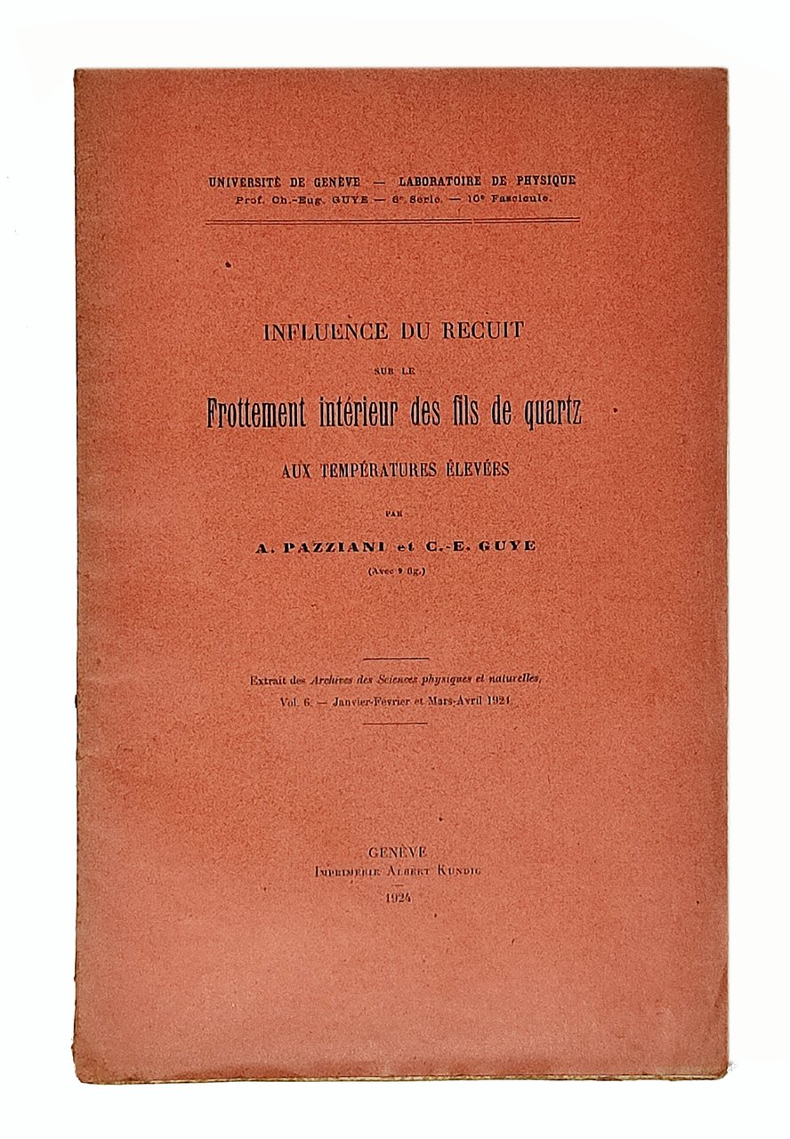 Universitè de Genève - Laboratoire de Physique. Extrait des Archives des Sciences physiques et naturelles. Pagine numerate: 44 (dalla numero 47 alla 90) + 2 tavole fuori testo. Lingua del testo: francese. Dimensioni: 16,5 x 25,5 cm circa. Stato di conservazione: piccoli taglietti sulle estremità del dorso (con piccola mancanza sul margine inferiore) ma, nel complesso, decisamente buono. Privo di scritte o sottolineature nel testo. qualche pagina ancora intonsa. Con 9 figure in nero nel testo. Interessante e particolareggiata opera di fisica (sullo studio dei fili di quarzo, paragonati a quelli di vetro) assai rara. DA COLLEZIONE