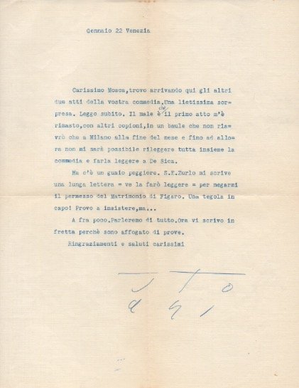 AUTOGRAFO Missive di argomento lavorativo. Si parla di commedie, del "Signor Bonaventura" e di problemi di censura. Lettera del 22 gennaio 1941: "[…] trovo gli altri due atti della vostra commedia. Una lietissima sorpresa. Leggo subito. Il male è che il primo atto m'è rimasto […] in un baule […] non mi sarò possibile rileggere tutta insieme la commedia e farla leggere a De Sica. […] Zurlo mi scrive una lunga lettera […] per negarmi il permesso del Matrimonio di Figaro. Una tegola in testa […]". Lettera del 26 gennaio 1941: "[…] In quanto al Matrimonio, ahimè, niente da fare per ora. Il censore è inesorabile. Ma io non rinunzio al desiderio di mettere su la commedia in tempi più propizi, quindi la vostra traduzione […] verrà il giorno che mi sarà preziosa […]". Lettera del 5 aprile 1941: "[…] la compagnia dell'Accademia sta per sciogliersi a Bologna e che perciò non porterà a Roma la vostra Nuvolinaria […]". Lettera del 28 aprile 1941: "[…] quest'estate devo fare in cinematografo una storia di Bonaventura e ci terrei tanto ad avere la vostra collaborazione per la sceneggiatura […]".