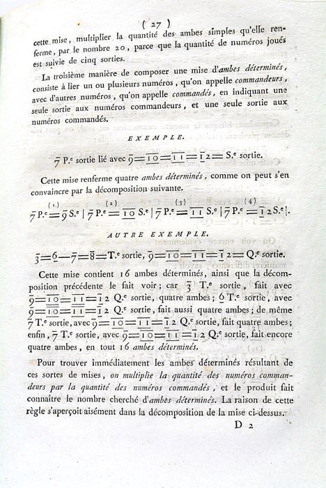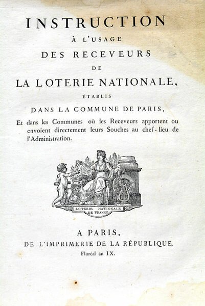 1 feuillet. 63 pages. 1 tableau. (25x20 Cm). Broché, couverture muette du temps. Partie importante de 1ère couverture et le 1er feuillet blanc manquante. Manques également sur le dos et au 2ème plat. Mouillures sur la page de titre. Taches et rousseurs éparses. Plis et traces de plis. Texte officiel concernant l'organisation de la loterie, rédigé par ses administrateurs. Il est suivi d'une "Instruction sur les Jeux d'Ambes déterminés" et de textes des lois, arrêts, décrets, etc. concernant la loterie. Une planche dépliante hors-texte contient plusieurs modèles des documents utilisés par les receveurs, notamment à Paris.