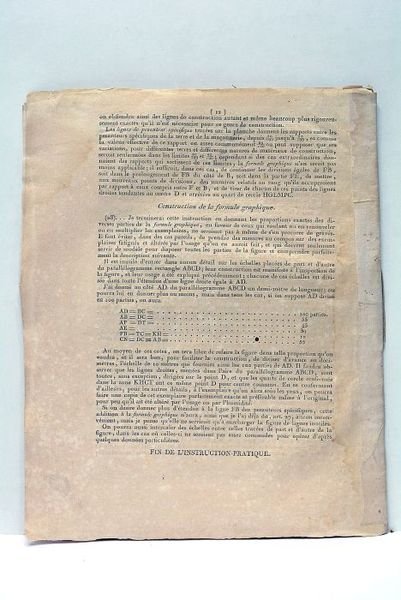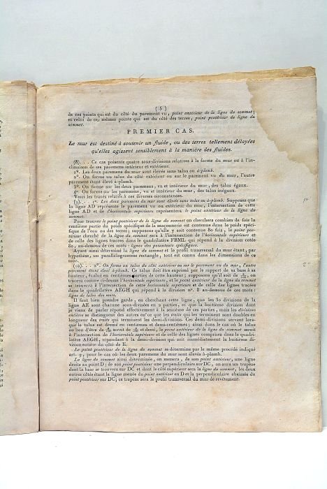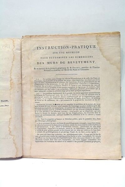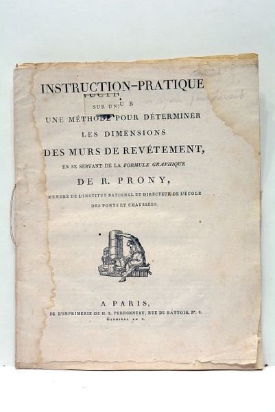 12 pages. Broché. Un petit morceau de la page de titre a été découpé (avec atteinte à 1 caractère). Non rogné. Mouillures. Petit trou de ver. Première édition. Mémoire de l'ingénieur et mathématicien Gaspar de Prony publié pour permettre l'application pratique de la formule graphique inventée par lui-même et utilisée pour la construction de murs de rétention. Ponts et Chaussées. Technique.