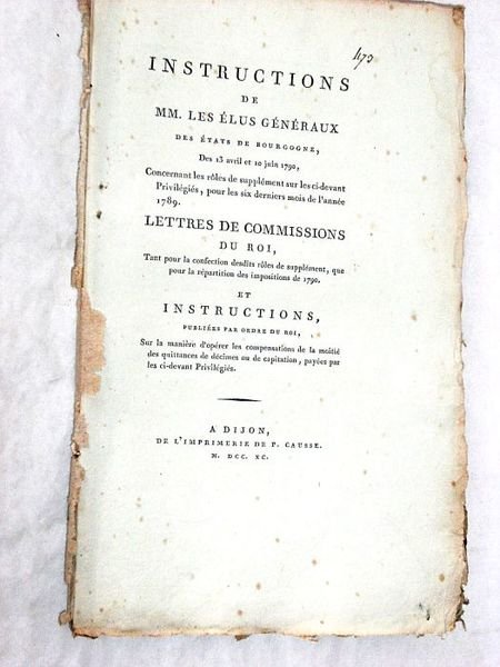 INSTRUCTIONS de MM. les élus généraux des États de Bourgogne, des 13 avril et 10 juin 1790, concernant les rôles de supplément sur les ci-devant privilégiés, pour les six derniers mois de l'année 1789. Lettres de commissions du Roi, Tant pour la confection desdits rôles de supplément, que pour la répartition des impositions de 1790. Et instructions, publiées par ordre du Roi, sur la manière d'opérer les compensations de la moitié des quittances de décimes ou de capitation, payées par les ci--devant privilégiés.