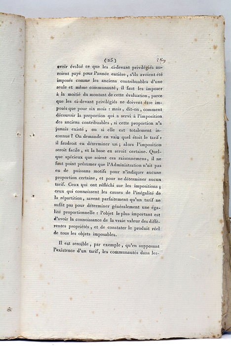 in-8. (1f.blanc). 85pp. (1f.blanc). Broché. Non rogné. Petites rousseurs. Publiée à Dijon en 1790 par l'imprimerie de P. Causse, cette brochure reflète une période de profondes mutations sociales et fiscales en France, à l'aube de la Révolution française. Elle compile les instructions des élus généraux des États de Bourgogne concernant l'imposition des anciennement privilégiés pour la fin de l'année 1789, ainsi que les directives royales pour la répartition des taxes de 1790. Ce document illustre comment, en pleine transformation révolutionnaire, l'effort pour une redistribution plus équitable des charges fiscales commençait à se concrétiser.