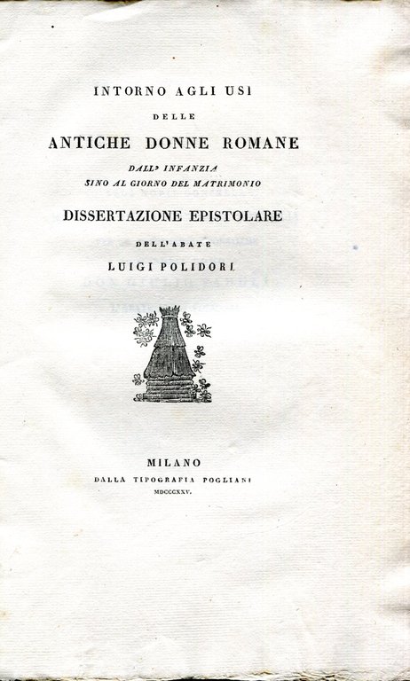 Intorno agli usi delle antiche donne romane dall'infanzia sino al giorno del matrimonio. Dissertazione epistolare. Alla nobil donzella Marianna de' Conti Della Somaglia per le faustissime sponsalizie col nobil uomo Don Giulio Paduli.