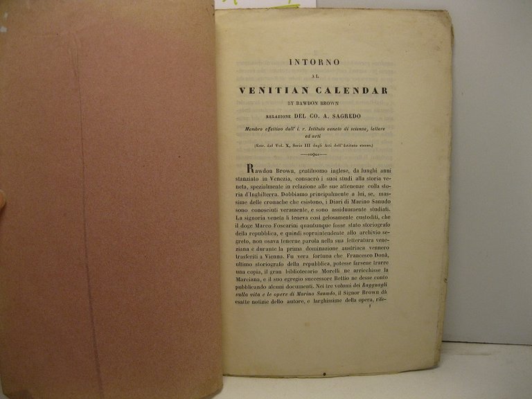 Intorno al venitian calendar by Rawdon Brown. Relazione del Co. A. Sagredo membro effettivo dell'i. r. Istituto veneto di scienze, lettere ed arti Estratto dal vol. X, serie III degli Atti dell'Istituto stesso