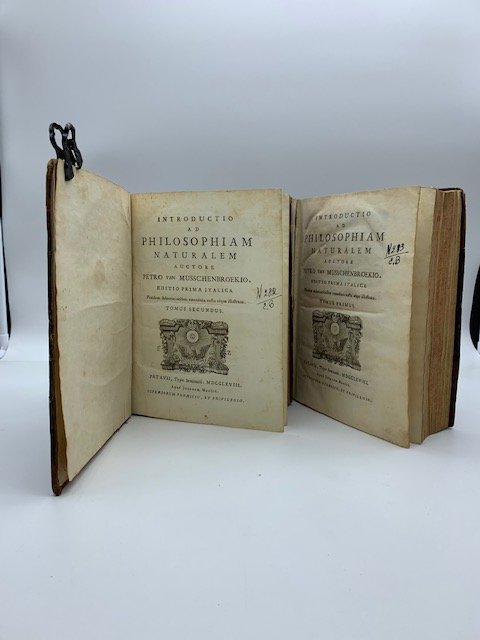 2 volumi in 8 (cm 17,5 x 24), pp. (16) + 477 + (1) + (2b) con 29 tavole finali ripiegate incise all'acquaforte (nella numerazione 2 tavole sono numerate come tavola 11) e stemma calcografico del dedicatario Girolamo Grimani inciso alla pagina 3 (le pagine da 145 a 152 numerate erroneamente 245-252); pp. 652 con 36 tavole finali ripiegate incise all'acquaforte (numerate da XXIX a LXIII, nella numerazione 2 tavole sono numerate come tavola 44) compresa una cartina ripiegata del mondo in cui la California e' mostrata come un'isola, 1 tavola con tabella ripiegata a pagina 192. Etichetta di ex libris con bollo di ceralacca ad entrambi i contropiatti anteriore, sigla manoscritta ai frontespizio. Legatura coeva in mezza pelle con angoli con segni di abrasione al dorso, ai tagli dei piatti e agli angoli. Prima edizione italiana, completa delle 65 tavole, degli studi di Petro van Musschenbroek (1692-1761) pubblicati in edizione originale postumi da Johann Lolofs nel 1762 poco prima della grande svolta nelle scienze fisiche del 1770. Musschenbroek fu uno dei grandi scienziati olandesi che tanto contribuirono nella prima meta' del Settecento alla diffusione dell'approccio newtoniano allo studio della filosofia naturale. L'opera costituisce un'epitome "delle cognizioni che allora si avevano in fisica, contiene inoltre molte ricerche particolari dell'autore sulla tensione delle corde, sull'elettricita', sulla coerenza dei corpi, sulle proprieta' di quelli che sono fosforescenti dopo essere stati esposti alla luce ed una tavola delle gravita' specifiche, la piu' ampia che fosse comparsa fino ad allora" ("Nuova enciclopedia popolare italiana", vol. XIV, 1862, p. 292).