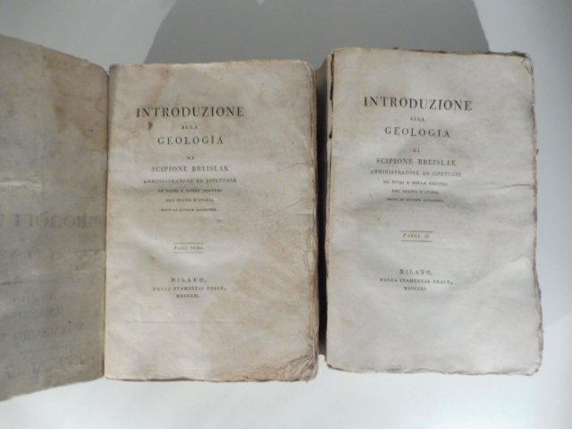 2 voll. in 8 (cm 14 x 22), pp. XXVII + (1) + 367 + (1); 490. Gora alle prime 70 pp. del I tomo. Brossura coeva con qualche gora ai piatti. Bordi intonsi. Edizione originale di quest'opera di geologia di Scipion Breislak, naturalista italiano di origine svedese. 'L'idea fondamentale dell'autore era che la materia del calorico e' una sostanza di un genere proprio, la quale esiste unita ad agli altri elementi della terrestre massa e deve essere mantenuta in quello stato di fluidita'. L'opera contiene un esattissimo elenco di tutti i vulcani dell'eta' presente ed un prospetto nel quale sono marcate le misure delle principali altezze del globo terrestre e questo prospetto, che ne contiene 750 riguardasi come il piu' compiuto di tutti quelli che si avevano prima nello stesso genere' (I secoli della letteratura italiana dopo il suo risorgimento, vol. VII, p. 269).
