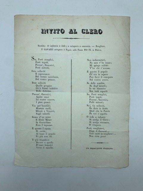 Manifesto cm 22 x 28,5, stampato al recto. Curiosa testimonianza in versi del passaggio a Padova il 24 maggio del 1848, del Padre Alessandro Gavazzi, uno dei maggiori propagandisti del risorgimento italiano, oratore celeberrimo, patriota, prima inviso sotto il papato di Gregorio XVI e poi esaltato nel periodo dell'avventura risorgimentale di Pio IX. Cappellano generale dell'armata pontificia, forte di 16.000 uomini, giunge in Veneto. Qui il Gavazzi, grazie al suo eloquio formidabile, in ogni luogo convince le popolazioni a fornire ai soldati aiuto, cibo, vestiario, munizioni. Dopo il suo passaggio, Piazza dei Signori a Padova fu chiamata Piazza Pio IX