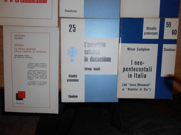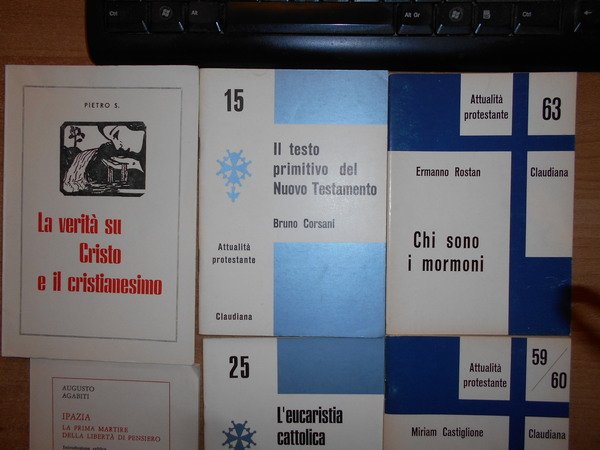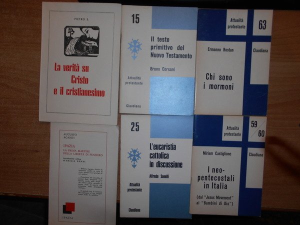 AA.VV. Torino, Claudiana, Cesena, << L' Antistato >>, Catania.1968/1969/1974/1962. 6 opuscoli in-16°, br. I titoli sono i seguenti: Ipazia la prima martire della libertà di pensiero - La verità su Cristo e il cristianesimo - Chi sono i mormoni - Il testo primitivo del Nuovo Testamento - L' eucarestia in discussione - I neo-pentecostali in Italia. Ben conservati. Neg. scat. 3 opusc. nonn.