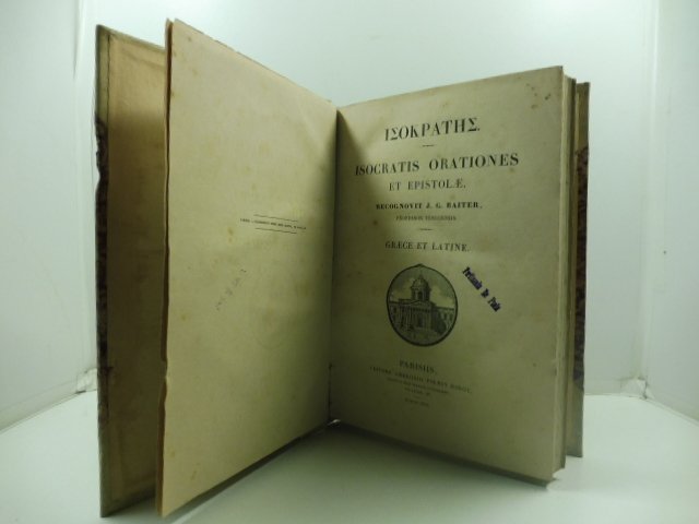 In 8, pp. II + 299 + (1b). Timbretto al fr. Legatura in mz. pg. con angoli. Testo su due colonne (greco e latino). Edizione critica curata da Johann Georg Baiter delle orazioni ed epistole di Isocrate. Collezione Vitroli, 58.