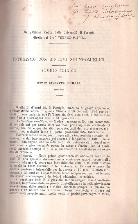 Estratto dall' "Archivio Italiano di Clinica Medica", puntata 4., anno 1896 - Fascicolo di 14 pagine. Invio autografo dell'autore alla prima pagina. Esemplare in buone condizioni.