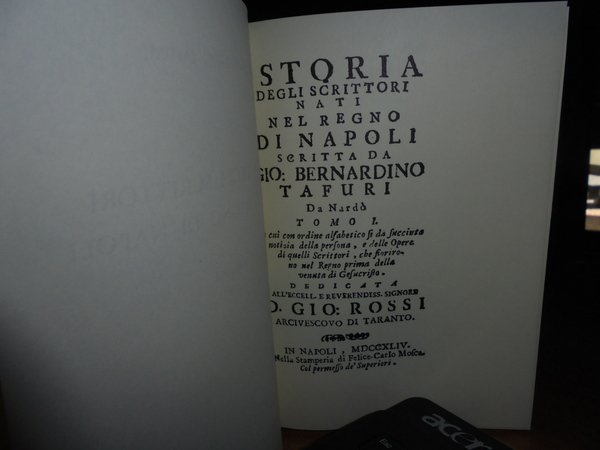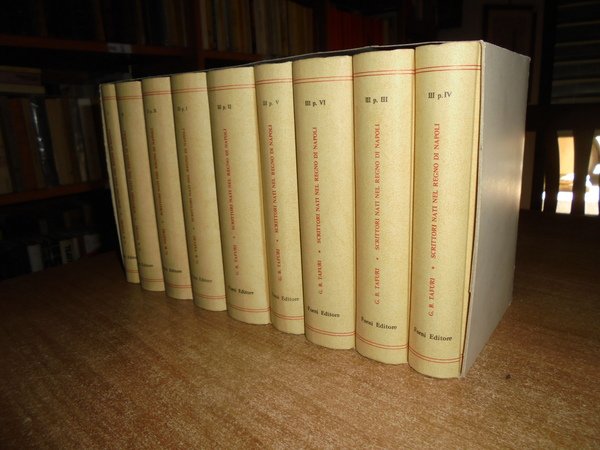 Bernardino, Tafuri. Bologna, Arnaldo Forni, 1974. Istoria degli Scrittori nati nel Regno di Napoli. 9 volumi in-16°, cartonato edit. (47), 308 pp.; (22), 490, (2) pp.; (12), 456 pp.; (12), 527, (9) pp.; 506, (32) pp.; (xxx), 456 pp.; (xii), 610 pp.; (6), 460 pp.; (xxiii), 407 pp. Ristampa anastatica identica all' edizione originale di Napoli. Come nuovi nell' astuccio in cartoncino muto con segni del tempo. Uff. A - II - 2 - 2