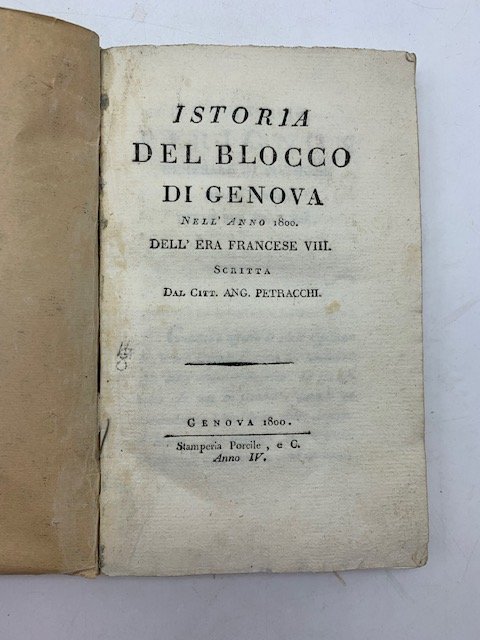 In 16 (cm 10 x 16), pp. 151 + (1 bianca). Cartonatura rifatta con carta d'epoca. Edizione originale, rara, di questo diario dell'assedio di Genova durante il quale si contrapposero la prima Repubblica francese contro la coalizione anglo-austriaca. Angelo Petracchi non e' un narratore super partes, appoggio' infatti i Francesi e le speranze legate al giacobinismo. Se da un lato l'A. espone in maniera rigorosa i fatti, dall'altro si profonde in descrizioni entusiastiche nei confronti degli esponenti della Republique, come nel caso di Andre' Massena, generale in comando, presentato nelle vesti di un eroe instancabile. "Il Petracchi. fu testimonio. La sua narrazione e importante perche' contiene particolari non raccolti dal Soult e dal Thiebault, e nota inoltre le impressioni che gli avvenimenti facevano sull'animo dei cittadini" ("Storia politica d'Italia", vol. 8, 1897, p. 626). Interessante la figura dell'A., Angelo Petracchi, personaggio eclettico. Avvocato romano di origine toscana, nacque nel 1762. Avviato alla carriera diplomatica, fu membro dei corpi legislativi cisalpini, diplomatico inviato in Toscana dalla Cisalpina, capo divisione nel ministero delle Finanze del Regno Italico. In seguito divenne fortunato impresario teatrale della Scala dal 1816 al 1820, ma anche poeta, appassionato di canto lirico, nonche' rivale d'amore di Ugo Foscolo nella contesa tra i due per l'amore di Antonietta Fagnani Arese. Si trasferi' poi a Londra dove fu direttore dell'opera italiana del King's Theatre. Mori' nel 1843 a Milano. Manno, 23299. Lumbroso, p. 140.