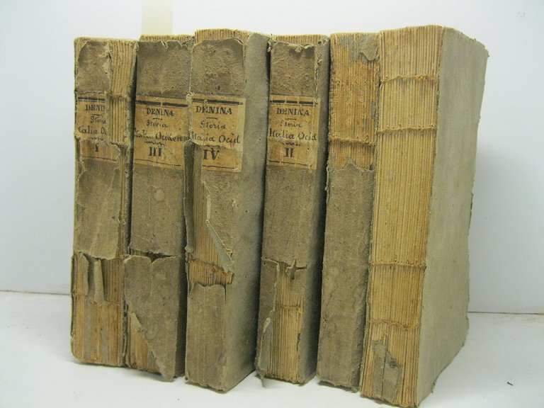 6 voll. in 8, pp. XLII + 286 + (8); 298 + (8); 362 + (10); 306 + (8); 336 + (8); 291 + (4). D. rifatti. Br. muta coeva. Fresco esemplare in barbe. Ed. originale di questa interessante opera del Denina sulla storia dell'Italia occidentale dai Galli a Napoleone I.