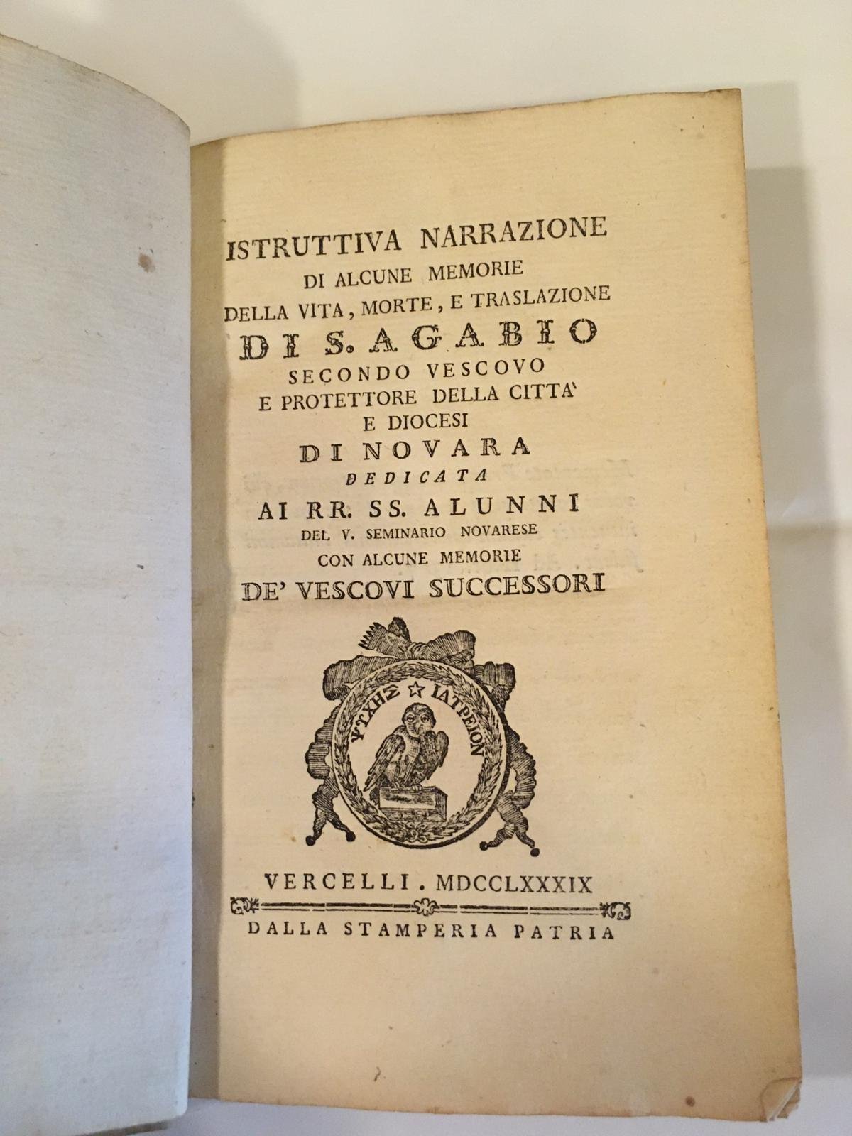 istruttiva narrazione di alcune memorie della vita, morte, e traslazione di s. Agabio secondo vescovo e protettore della città e diocesi di Novara dedicata ai RR. SS. alunni del V. seminario novarese con alcune memorie de' vescovi successori