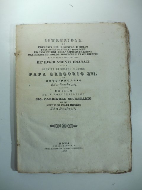 Istruzione ai preposti del registro e bollo, conservatori delle ipoteche ed inspettori dell'amministrazione del registro, bollo, ipoteche e tasse riunite per la retta applicazione de' regolamenti emanati