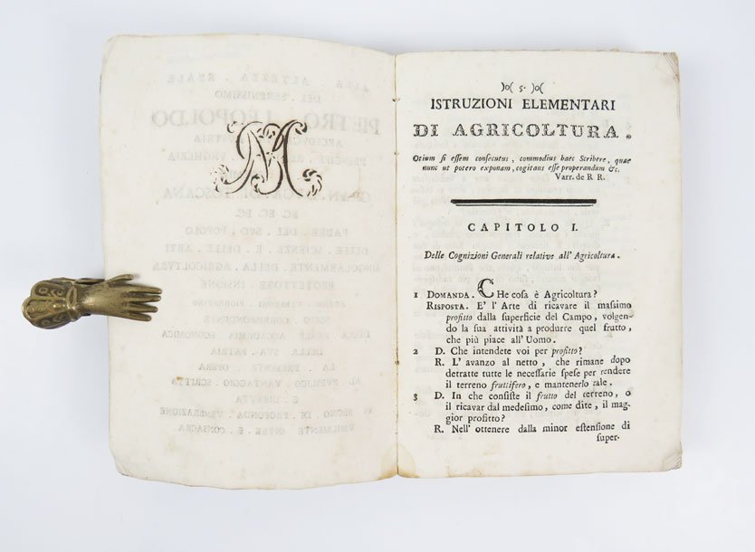 LIBRO Prima edizione. Bell’esemplare. Curioso manuale di agricoltura in forma di domande e risposte su tutti gli aspetti delle coltivazioni agricole. “Domanda. Che cosa è Agricoltura? | Risposta. E’ l’Arte di ricavare il massimo profitto dalla superficie del Campo, volgendo la sua attività a produrre quel frutto, che più piace all’Uomo. [.]” (‘Capitolo I. Delle Cognizioni Generali relative all’Agricoltura’, p. 5). Niccoli, Saggio storico e bibliografico dell'agricoltura italiana, p. 68
