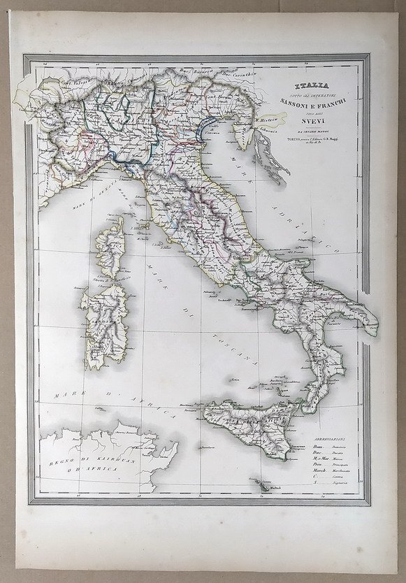 Edizione: carta in ppartenente all'atlante universale di geografia antica e moderna redatta sui migliori documenti astronomici e dietro le scoperte dei piã¹ recenti esploratori da maggi e cassella colla scorta del compedio di geografia di adriano balbi - totino, presso l'editore gio. batt. maggi.