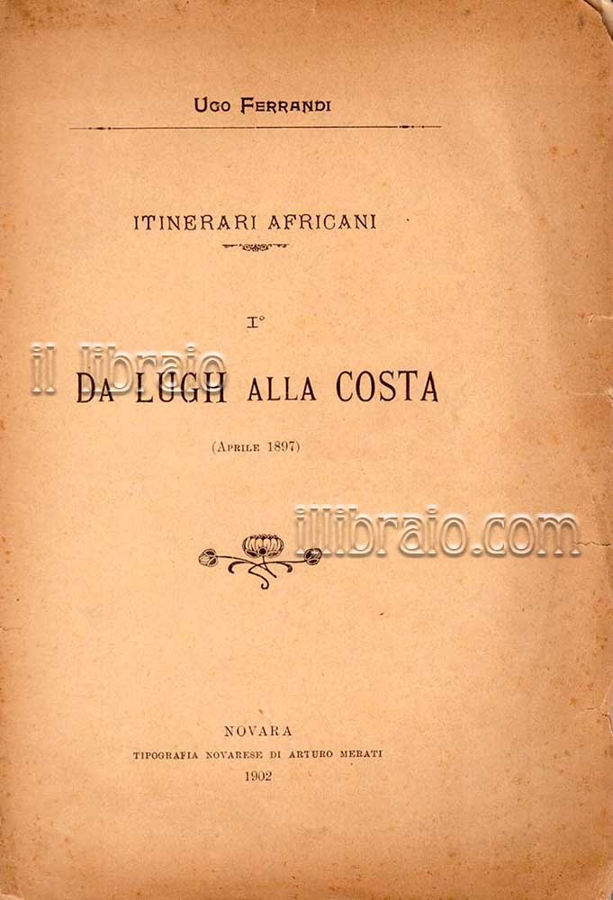 in 8°; pp. 62 + 1 tav. (ill. in bn.); br. Primo, e unico, volume di questo racconto di viaggio del novarese Ugo Ferrandi, nato nel 1852, morto nel 1928. Capitano, giornalista, esploratore, alto funzionario del Ministero delle Colonie, visitò e studiò i paesi del Corno d'Africa, scrisse vari saggi sugli usi e i costumi dei popoli locali. Compagno di Bottego nella sua seconda spedizione, gli venne affidato il comando di Lugh (Somalia), in un territorio ostile, soggetto alle razzie degli Amhara