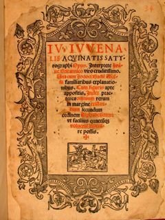 IV. IUVENALIS AQUINATIS SATIROGRAPHI OPUS. Interprete Ioane Britannico viro eruditissimo. Una cum Iodoci Badii Alcessii familiaribus explanationibus. Cum figuris apre appositis. Inder praeterea omnium rerum in margine eristentium secundum ordinem alphabeticum: ut facilius quaecunquorum volueris invenire possis. Venetiis. Ex Aedibus Ioannis Francisci & Ioannis Antonii Fratres eius de Rusconibus. MDXXIII. die II. Mensis Iunii. Regnante inclyto Principe Andrea Griti Duce Venetiarum.
