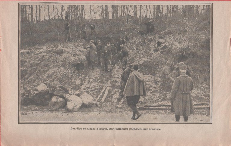 IWW. Derriere ce rideau d'arbres nos fantassins preparent une tranchee. 1915